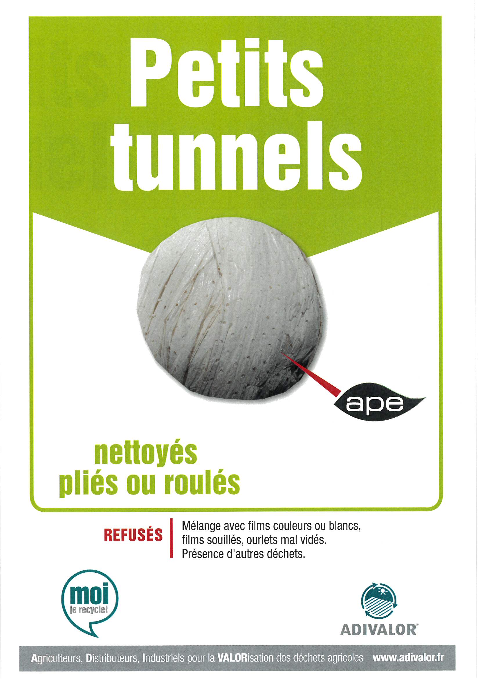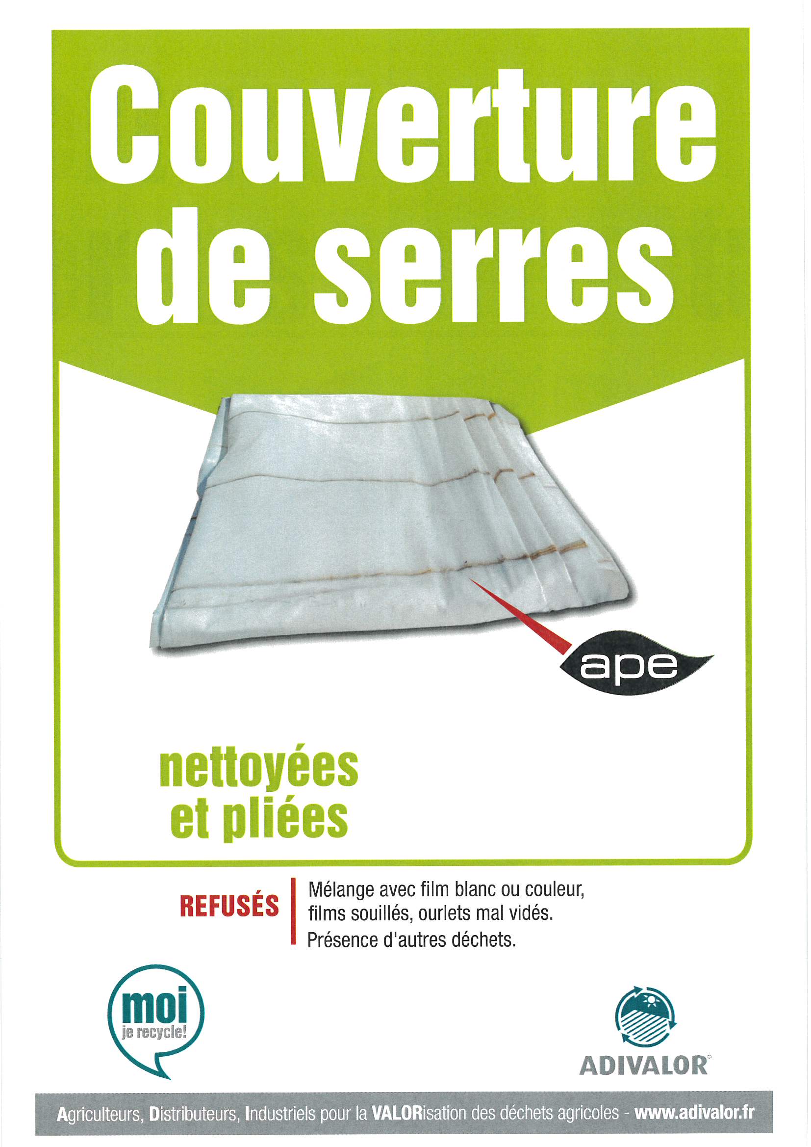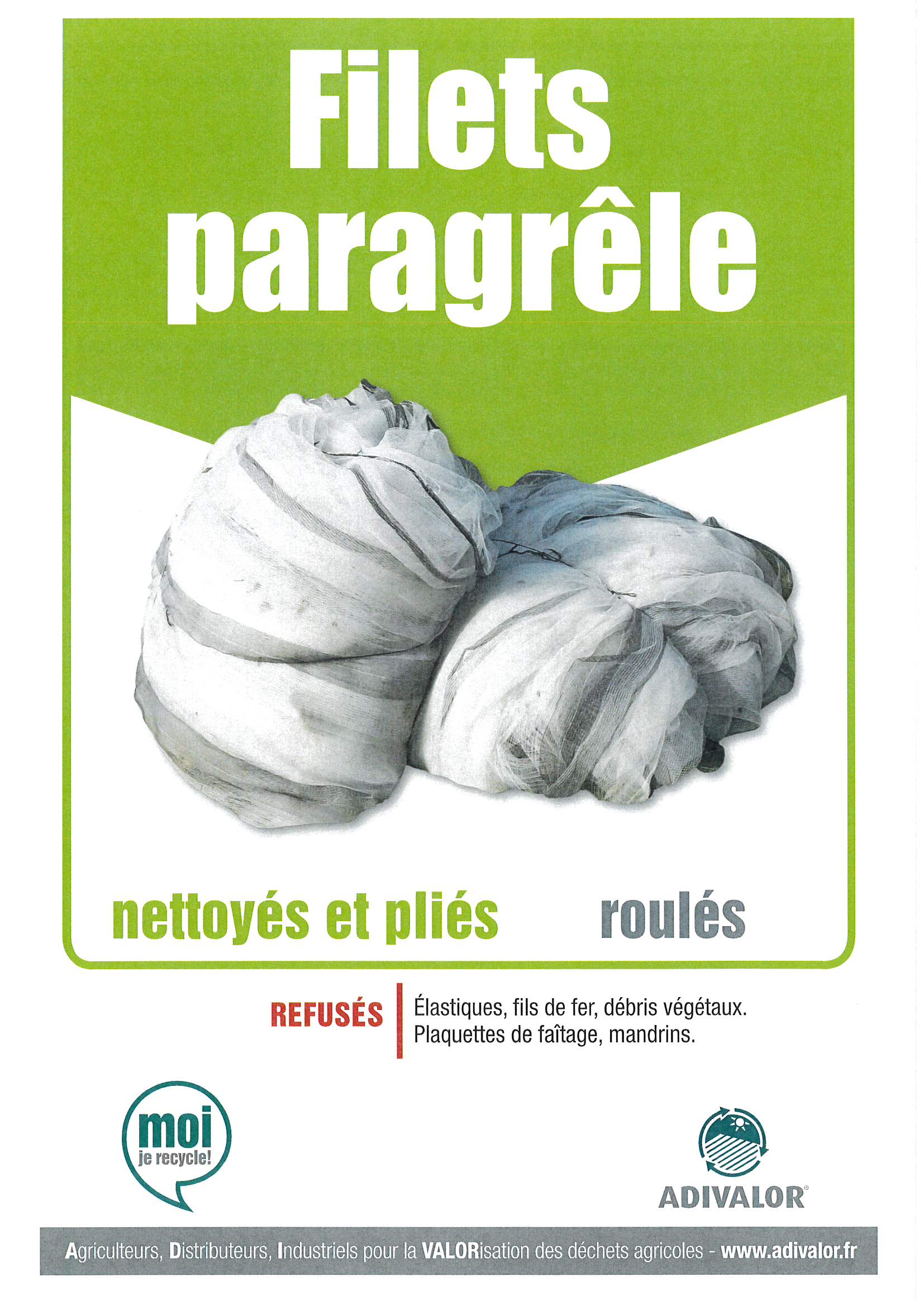 | ATTENTION : pas de débris végétaux, pas de mandarin, ôter les élastiques, possibilité d’une collecte directement sur exploitation de 2,5 hectares de filets à récupérer. >>> Consignes | ||