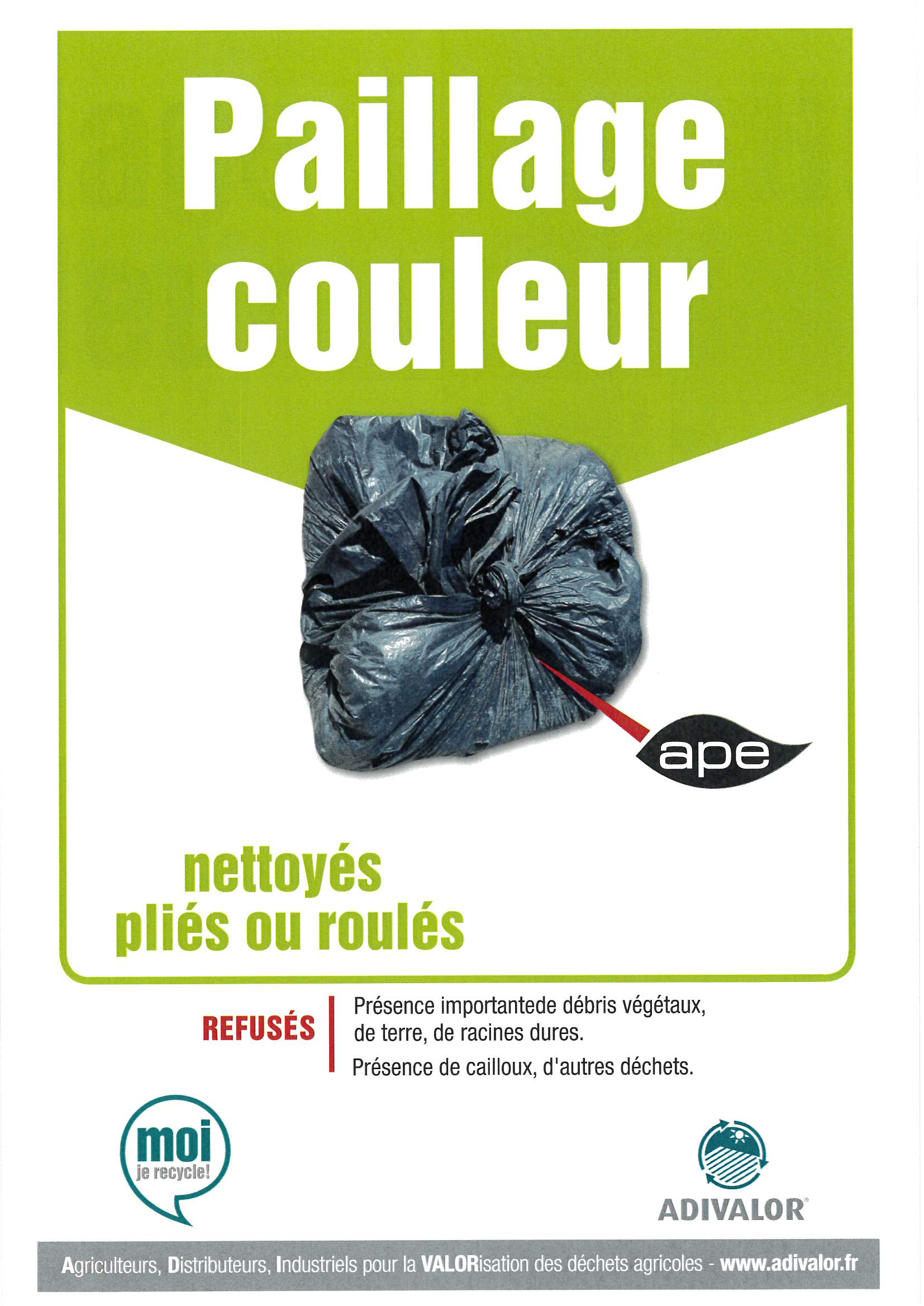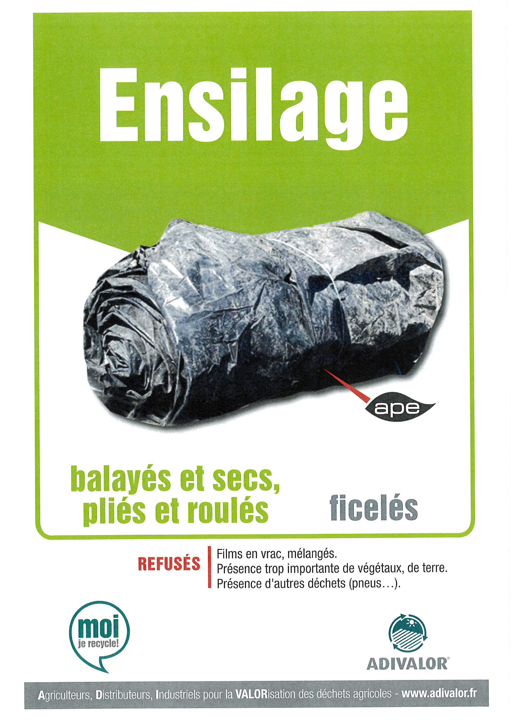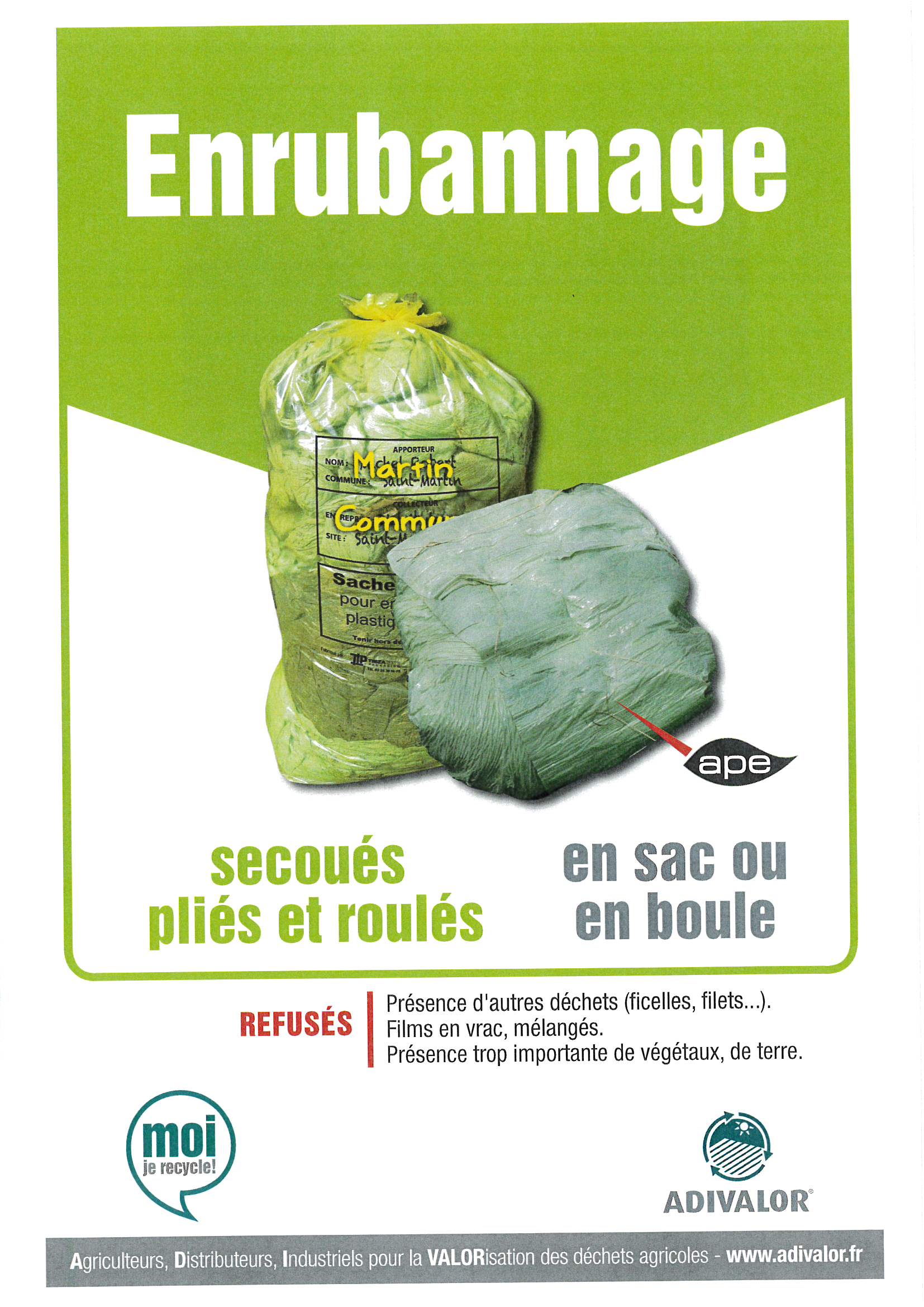 | Sacs ADIVALOR de 250 litres disponibles aux Services techniques, ATTENTION : balayer les bâches, les enrouler correctement, mettre les bâches d’ensilage en sacs sans autres déchets, inscrire les coordonnées de l’exploitation sur le sac pour la traçabilité. >>> Consignes Un film YouTube est accessible afin de comprendre la filière de l’enrubannage et les consignes de tri : Cliquez ici | |