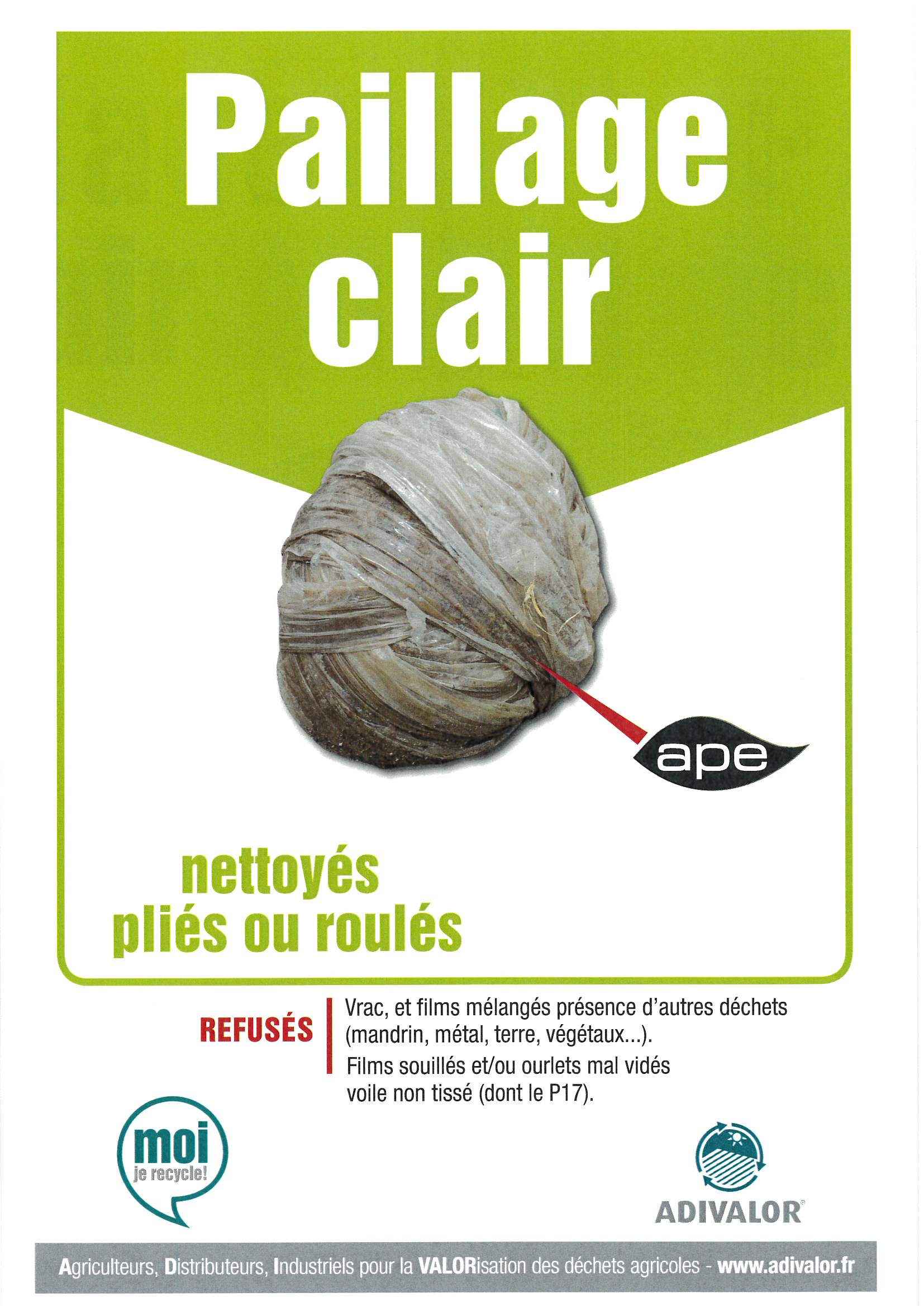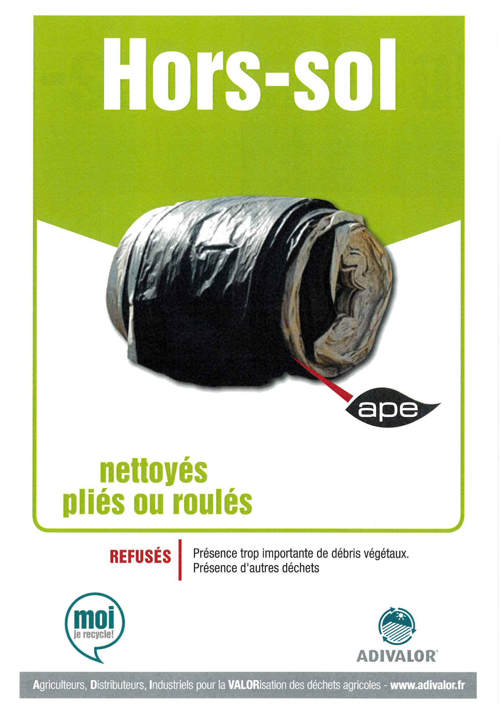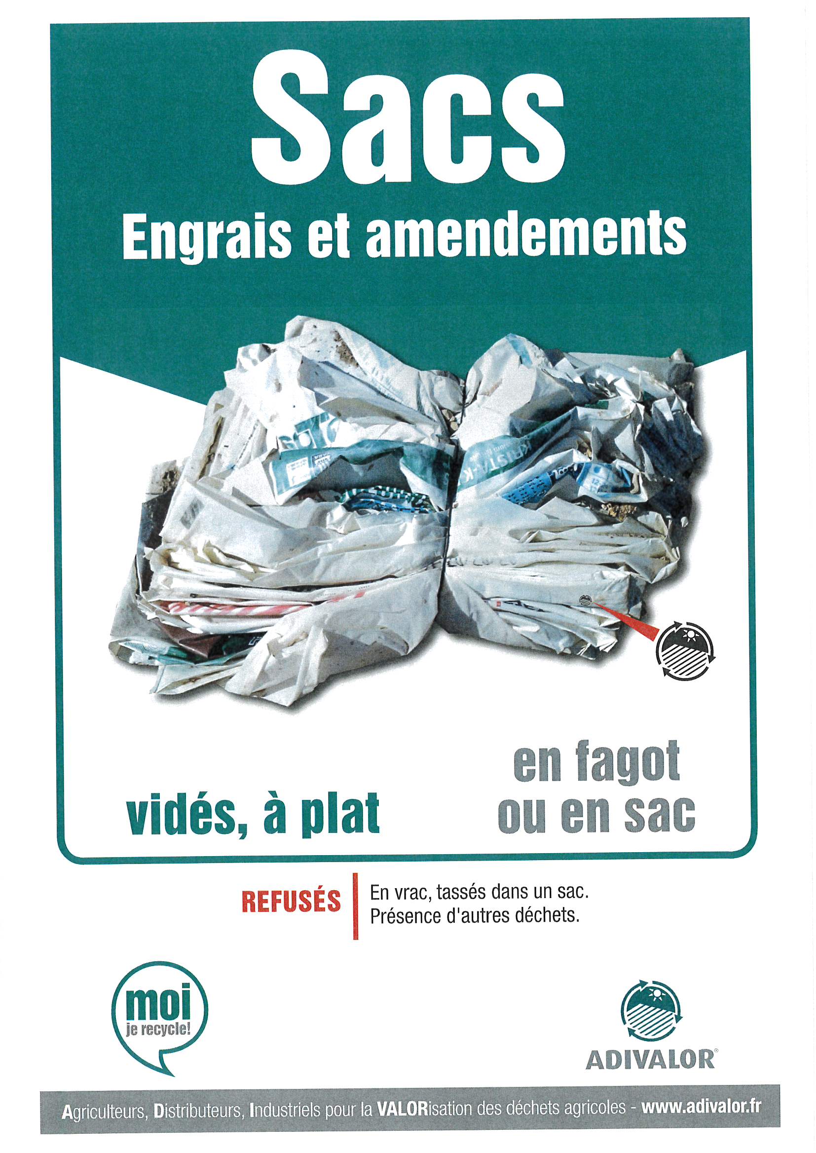 | Sacs ADIVALOR de 250 litres disponibles aux Services techniques, ATTENTION : balayer les bâches, les enrouler correctement, mettre les bâches d’ensilage en sacs sans autres déchets, inscrire les coordonnées de l’exploitation sur le sac pour la traçabilité. >>> Consignes Un film YouTube est accessible afin de comprendre la filière de l’enrubannage et les consignes de tri : Cliquez ici | |