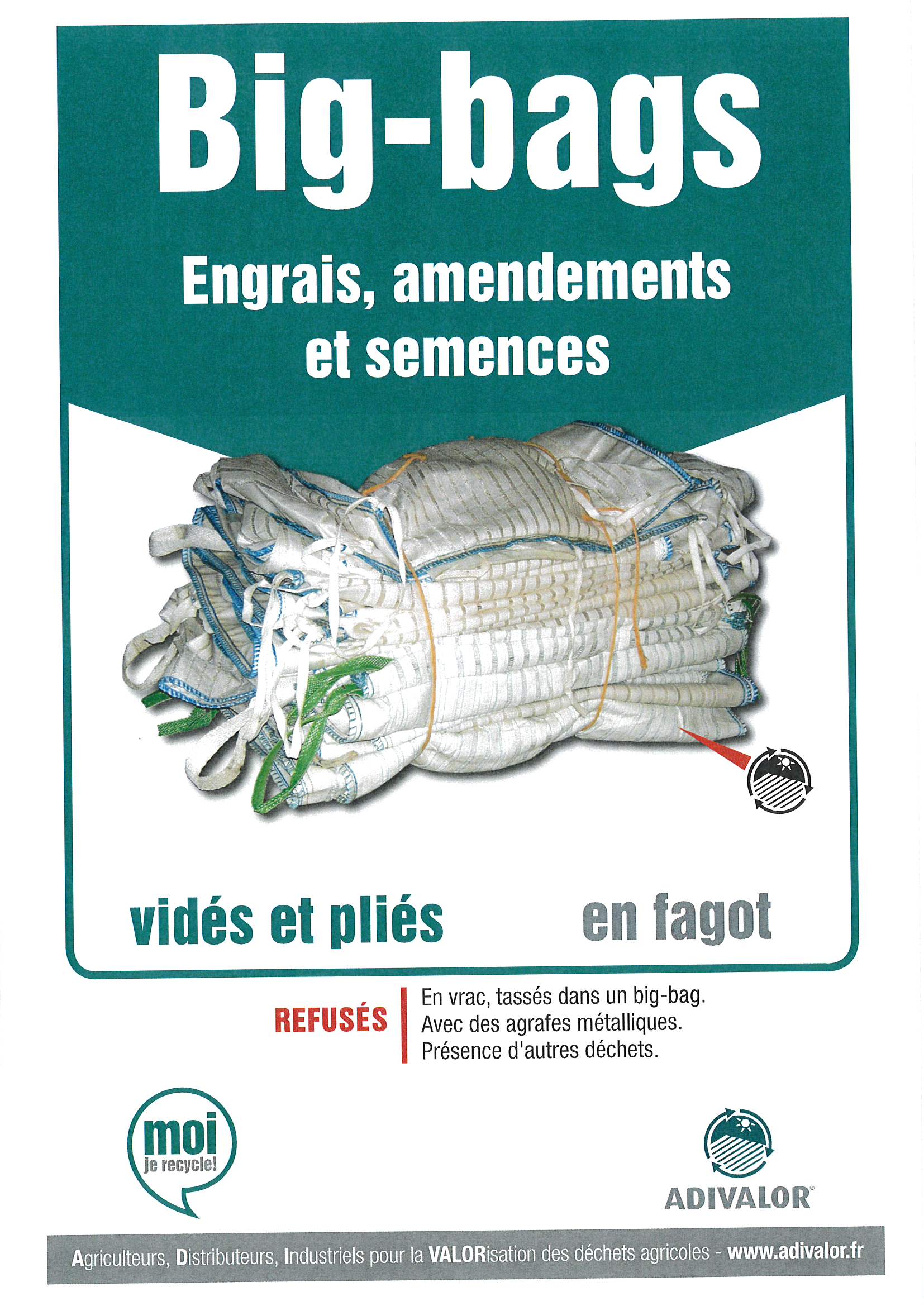 ![]() | ![]() | ATTENTION : bien vider les sacs, les plier, ne pas insérer plusieurs big bags dans un, (idem pour les sacs) constituer des fagots. >>> Consignes Un film YouTube est accessible afin de comprendre cette filière et les consignes de tri : cliquez ici |