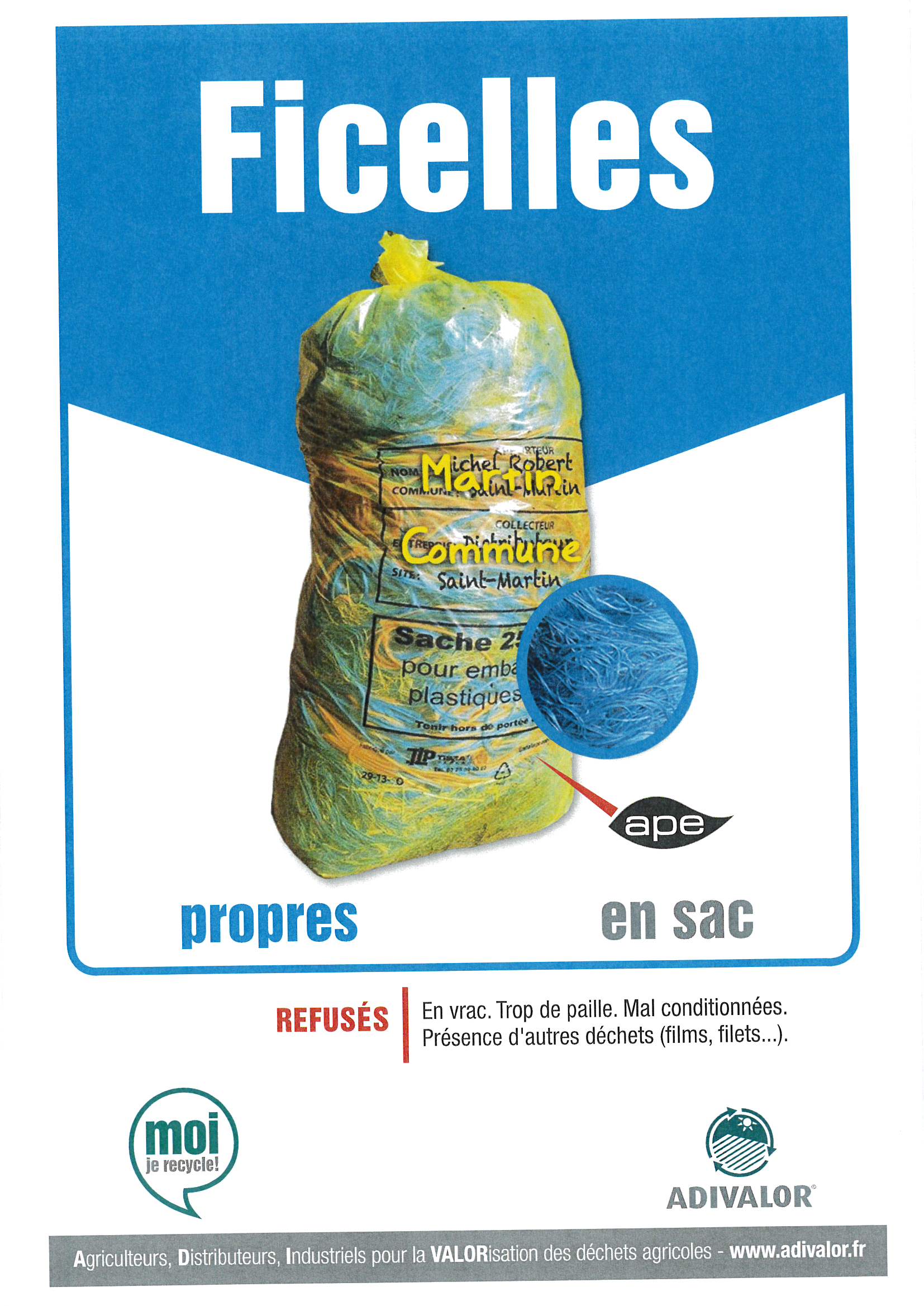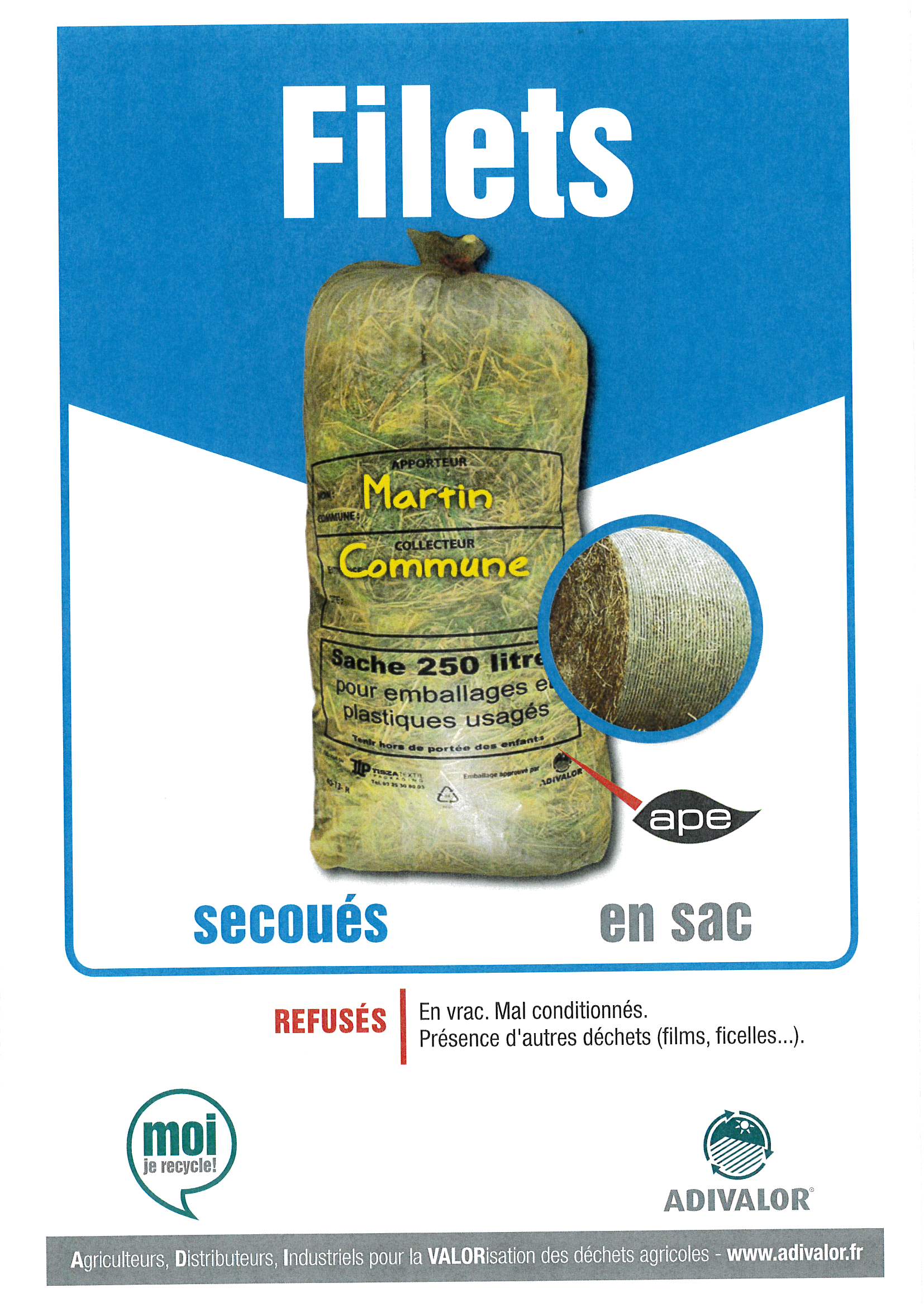 ![]() | ![]() | Sacs ADIVALOR de 250 litres disponibles aux Services techniques, ATTENTION : pas de mélange entre ficelles et filets, sacs distincts, pas d’autres déchets, penser à écrire les coordonnées de l’exploitation sur le sacs pour la traçabilité >>> Consignes Un film YouTube est accessible afin de comprendre la filière des filets de balles rondes et les consignes de tri : Cliquez ici | |